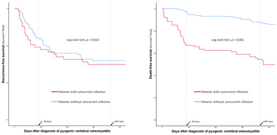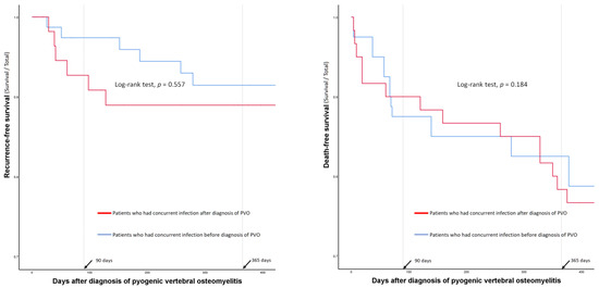 Surgical treatment, including early spinal instrumentation (within 6 weeks of PVO diagnosis), was more frequently performed in patients without concurrent infections (Table 3). However, complications associated with surgery or the long-term use of antibiotics were not significantly different between the groups (Table 3). The duration of antibiotic administration and hospital stay were significantly longer in patients without concurrent infections than in those with concurrent infections. There were no significant differences in recurrence rates or recurrence-free survival between the two groups (14% vs. 14%; p = 0.965) (Table 3 and Figure 2). However, the 90-day mortality (17% vs. 2%; p < 0.001) and 1-year mortality (23% vs. 6%; p < 0.001) rates were significantly higher in patients with concurrent infections than in those without (Table 3 and Figure 2).