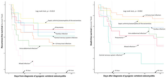 Finally, we further divided patients with single concurrent infections into two groups according to the time of diagnosis of concurrent infections: those who had concurrent infections before and after the diagnosis of PVO. We calculated the 1-year recurrence and mortality rates and their 95% confidence intervals according to the types of concurrent infection and their timing of diagnosis using the Hosmer–Lemeshow method.