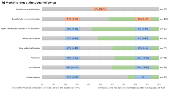 The clinical outcomes of patients with concurrent infections varied considerably according to the type of infection (Figure 5). Even in patients with the same type of concurrent infection, recurrence and mortality rates differed according to the diagnostic timing of concurrent infection. Therefore, we presented the 1-year recurrence and mortality rates in our cohort according to these factors (Figure 5). Generally, patients who had concurrent infections after the diagnosis of PVO had a higher recurrence rate than those who had concurrent infections before the diagnosis of PVO. Conversely, mortality rates are generally higher in patients with concurrent infections before the diagnosis of PVO. Based on these findings, the higher 1-year mortality rates of patients with concurrent nervous system infections, pneumonia developing after the diagnosis of PVO (mostly identified as aspiration pneumonia), intra-abdominal and cardiac infections developing before the diagnosis of PVO, and multiple concurrent infections should be noted.