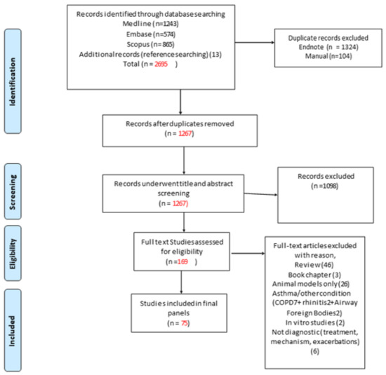 The initial literature search identified 2695 articles (Figure 1). Following the removal of 1428 duplicate articles, 1267 articles underwent title and abstract screening. That screening process identified 169 articles for full-text review. Of those, 75 studies were deemed relevant while 94 studies were excluded (11 reporting other conditions such as rhinitis/COPD, 26 studies were on animal models only, 49 reviews and book chapters, 6 studies were not diagnostic, and 2 were in vitro studies). The final 75 studies were classified into two categories based on the clinical use of miRNAs for either asthma diagnosis or asthma phenotyping. For each category, the miRNAs were grouped according to the source of sample to exhaled breath condensate (EBC), Bronchoalveolar lavage (BAL), bronchial epithelial cells (BEC), lung tissue, and blood (serum, plasma, lymphocytes, PBMCs (peripheral blood mononuclear leukocytes), or whole blood). All selected studies were prospective.