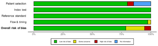 Included papers were assessed for quality and bias by two researchers (MAK and EV) using the Quality Assessment of Diagnostic Accuracy Studies-2 (QUADAS-2) tool through resources available at the QUADAS-2 website https://www.bristol.ac.uk/population-health-sciences/projects/quadas/resources/with (accessed on 14 February 2021) for levels of “high”, “low”, and “unclear” risk of bias.