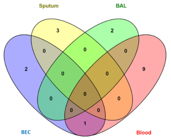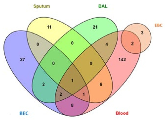 Eight miRNAs (miR-126, let-7e, miR-224, miR-143, miR-181b-5p, miR-378, miR-27b-3p, and miR-221) were shared between blood and BEC. Six miRNAs (miR-223-3p, miR-142-3p, miR-125b, miR-16-5p, miR-4284, and miR-199a-5p) were shared between blood and sputum. Four miRNAs (let-7b, miR-339-3p, miR-615-3p, and miR-30a) were shared between blood and BAL. Two miRNAs (miR-126-3p and miR-21-5p) were shared between blood and EBC. Two miRNAs (miR-19a and miR-27a) were shared between BEC and BAL. Two miRNAs (let-7a and miR-21) were shared among BEC, BAL and blood. One miRNA (miR-221-3p) was shared among BEC, sputum, and blood. Finally, only one miRNA (miR-155) was shared among blood, BAL, airway cells, and sputum.