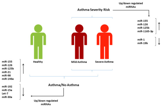 Despite the increasing evidence that miRNAs play important roles in asthma, the studies performed so far were mostly conducted in in vitro or animal models of asthma, and evidence in humans remains limited. Thus, adequately powered studies are now needed to improve our insight into the role of miRNAs in relevant human cells and tissues [66]. Here, we reviewed human studies available so far and selected panels of miRNAs that can serve as core panels to investigate the practicality and efficiency of using microRNAs as non-invasive biomarkers in blood for asthma diagnosis and severity-risk assessment. Further studies to assess the clinical utility of such diagnostic and severity-risk miRNA panels in asthma as well as functional roles of those miRNAs in the pathogenesis and clinical expression of asthma should be a future research focus.