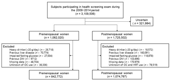 Among 3,109,506 women who were enrolled, we excluded those whose information regarding menopausal status was uncertain (n = 321,984). In addition, those who were considered heavy drinkers with more than 20g of alcohol consumption per day (n = 26,718 pre-menopausal, n = 18,572 post-menopausal); those who were diagnosed with liver disease, including hepatocellular carcinoma, liver cirrhosis, and other chronic liver diseases (n = 70,774 pre-menopausal, n = 160,091 post-menopausal); those with a fasting glucose level of more than 126 mg/dL (n = 27,004 pre-menopausal, n = 118,878 post-menopausal); those who had already been diagnosed with DM (n = 9712 pre-menopausal, n = 103,696 post-menopausal); and those who answered ‘unknown’ to the questionnaires about both hormone replacement therapy and oral contraceptive history (n = 170,979 post-menopausal) or oral contraceptive history alone (n = 36,336 pre-menopausal) were excluded. As a result, 1,917,539 total individuals (842,772 pre-menopausal and 1,074,767 post-menopausal women) were included in the analysis (Figure 1).