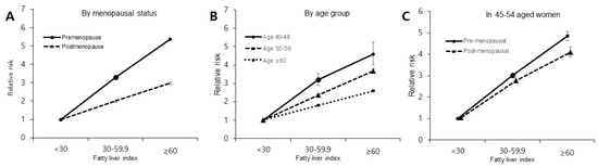 Considering the relationship between NAFLD and DM risk can be affected by specific age-related factors, stratification analysis was performed by age group (40–49 years, 50–59 years, and ≥60 years), and additional analyses were performed in a narrower age range of 45 to 54 years, in which the perimenopausal transition occurs [17].