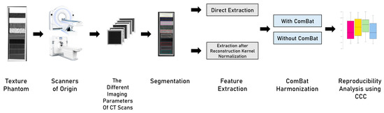 Different methods have been investigated to address the issue of reproducibility of HRFs across scans acquired differently. ComBat harmonization [39] is one of the post-processing methods that have recently been extensively investigated in radiomics analyses [40,41,42]. ComBat harmonization is a method that was developed for removing batch effects—attributed to the use of different machinery—from gene expression arrays. A number of studies have reported on the applicability of ComBat harmonization in different scenarios, such as scans acquired with varying degrees of differences in CT image acquisition and reconstruction parameters, scans acquired with a single variation in an image reconstruction parameter (in-plane resolution) and scans of different contrast-enhancement phases [31,35,43,44]. These studies reported that the performance of ComBat in radiomics analyses is dependent on the variations in the data being harmonized. A number of studies have also investigated the potential of ComBat in different scenarios [45,46,47,48]. However, the potential of ComBat to remove batch effects attributed solely to the variations in the reconstruction kernel has yet to be thoroughly investigated. Other investigated methods include pre-processing of the images to minimize effects due to differences in slice thickness, reconstruction with convolutional kernels, etc. Normalization of chest CT data minimized the variability that resulted from different reconstruction kernels [49]. The authors developed a method that targeted reducing the variations in the quantification of emphysema by normalizing the reconstruction kernel (Reconstruction Kernel Normalization—RKN). The CT scans obtained from different scanners that were reconstructed with varying kernels showed reduced variability in emphysema quantification after the proposed iterative normalization. However, the effect of this normalization method on the reproducibility of HRFs has not been investigated.
