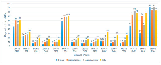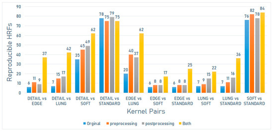 On the SOMATOM definition scanner model (Siemens), the number of reproducible HRFs extracted from the scans after image pre-processing varied between 7 (7.7%) and 69 (75.8%). The greatest increment in the number of reproducible HRFs compared to the original images was observed across scans acquired with I50f and I70f kernels (Figure 4).