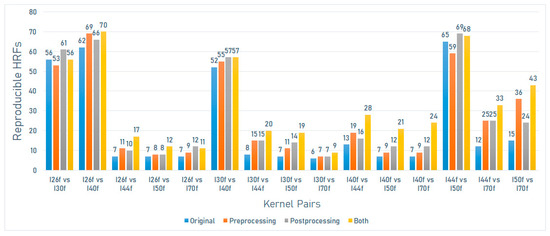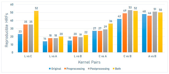 On the Brilliance 64 scanner model (Philips), the number of reproducible HRFs extracted from the scans after image pre-processing varied between 18 (19.8%) and 49 (53.8%). The greatest increment in the number of reproducible HRFs compared to the original images was observed across scans acquired with L and C kernels (Figure 6).