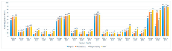 The number of HRFs that became reproducible following the application of the described method varied with the variations in kernels being harmonized and the scanner model used. In most of the investigated scenarios (58 out of 67; 86.6%), the use of this method has resulted in an increment in the number of reproducible HRFs. However, only 19 scenarios (28.4%) showed statistically significant increments. In a number of scenarios (6 out of the analyzed 67 scenarios (9%)), there was a net loss in the number of reproducible HRFs compared to the original, 2 (3%) of which were statistically significant (Figure 2, Figure 3, Figure 4, Figure 5 and Figure 6). In three (4.5%) scenarios, there was no difference between the number of reproducible HRFs extracted from the original and the normalized images.