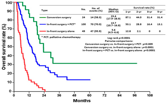 Kaplan–Meier survival curves in patients that underwent conversion surgery, in-front surgery plus palliative chemotherapy (PCT), and in-front surgery alone.