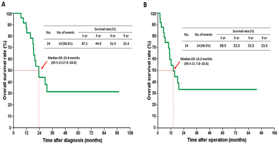 In the conversion surgery group, the median OS of 24 patients was 23.4 months after the initial diagnosis (95% confidence interval [CI], 17.9–28.9) and 14.2 months after the operation (95% CI, 7.8–20.6), respectively (Figure 2A,B). The 1-, 3-, and 5-year OS rates were 87.1%, 31.4%, and 31.4%, respectively, after the initial diagnosis and 59.5%, 33.5%, and 33.5%, respectively, after the operation. Patients with downstaging had a significantly better OS after the initial diagnosis than those without downstaging (Figure 3A; p = 0.016). The 1-, 2-, and 3-year OS rates were 100%, 54.2%, and 45.1%, respectively, and 66.7%, 27.8%, and 0%, respectively, in the downstaging vs. non-downstaging groups. Figure 3B shows that the median OS after the surgery was significantly longer in patients with downstaging than in patients without downstaging (19.4 vs. 5.8 months; p = 0.011).