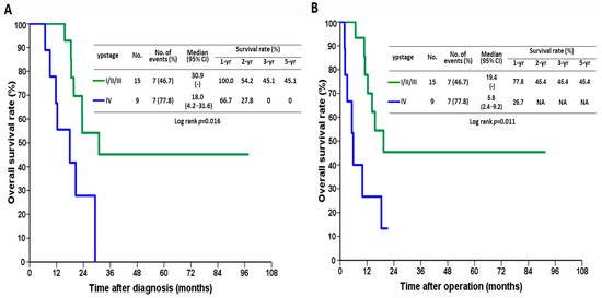 Kaplan–Meier survival curves after the (A) initial diagnosis and (B) operation in terms of yield pathological stage (ypstage).