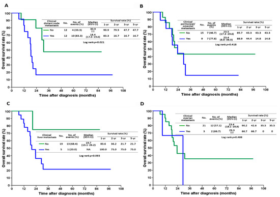 We also analyzed the impact of metastasis site on survival in the conversion surgery group. Patients without distant node metastasis had better prognosis than those with distant node metastasis (Figure 4A; p = 0.021). In contrast, there were no significant differences in patient outcomes in terms of peritoneal/omental (Figure 4B; p = 0.418), liver (Figure 4C; p = 0.093), or ovarian metastasis (Figure 4D; p = 0.488).