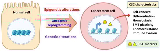 Cancer stem cells (CSCs) are a small subset of cancer-initiating and/or cancer maintenance cells in the cancer mass. CSCs exhibit similar characteristics as that of normal stem cells, such as self-renewal, differentiation, and homeostasis. However, CSCs usually acquire genetic and epigenetic alterations that allow CSCs to evade tumor suppression mechanisms (Figure 1) [1,2,3,4]. For example, CSCs can enter into dormancy to escape from immunosurveillance and anticancer therapy [5]. Therefore, many conventional anticancer therapeutics fail to completely eradicate CSCs, leading to cancer relapse and metastasis [6,7,8]. To overcome this as of yet unresolved clinical need, a better understanding of CSC characteristics is essential for the design of CSC eradication strategy.