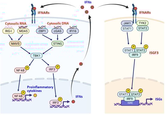 The type I interferons (IFNs), including IFN-α and IFN-β, are innate cytokines that are equipped to every cell as the first-line immune response to combat invaded pathogens. Upon infection, the pathogenic nucleic acids can be detected by a variety of pattern recognition receptors (PRRs), which then transmit these “danger signals” through STING-TBK1 and MAVS-TBK1 axes to activate the hub transcription factors NF-kB and interferon regulatory factor 3 (IRF3), thereby allowing these transcription factors to translocate into the nucleus and turn on the gene expressions of type I interferons and pro-inflammatory cytokines. Depending on the nature of nucleic acids in the cytosol, the cells use different PRRs to detect viral DNA, such as cGAS, IFI16, DDX41, AIM2, ZBP1/DAI, RNA polymerase III, and viral RNA, such as DDX58/RIG-I, IFH1/MDA5, and Toll-like receptors (TLRs) 3, 7, 8, 9 [33] (Figure 2). In addition to viral nucleic acids, self-cytosolic nucleic acids can also trigger interferon response. The sources of self-cytosolic nucleic acids include DNA damage fragments from the nucleus or mitochondria, leaky DNA from micronucleus, and viral mimicry RNA from ERV elements [28,34,35,36,37].