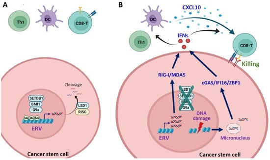 Inhibition of epigenetic modifiers in the induction of interferon response and recruitment of CD8+ T cells. (A) The histone modifiers LSD1, SETDB1, BMI1, and G9a are overexpressed in cancer stem cells (CSCs), leading to silencing of endogenous retrovirus (ERV) by the hypermethylation and degradation of cytosolic RNA by the RNA-induced silencing complex (RISC). As a result, the interferon response is suppressed and the CSCs are kept away from the killing of cytotoxic CD8+ T cells; (B) Inhibition of LSD1, SETDB1, BMI1, or G9a results in de-repression of ERV and induction of interferons (IFNs) through RIG-I/MDA5. Besides, inhibition of these epigenetic modifiers causes DNA damage and increases micronucleus formation, leading to elevation of cytosolic DNA and induction of IFNs through cGAS/IFI16/ZBP1. The secreted IFNs activate dendritic cells (DC) and type 1 T helper cells (Th1), which produce the T-cell attractive chemokine CXCL10 to recruit CD8+ T cells for the killing of CSCs. Me, methylation. Graph created with Biorender.com.