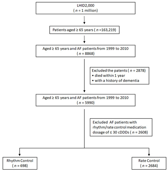 We and other groups have reported that the rhythm control of AF via catheter ablation (CA) lowered the risk of dementia in long-term follow-up cohorts, suggesting that rhythm control might prevent cognitive dysfunction [4,5]. Despite the number of AF patients receiving CA doubling over the last decade in Western countries, the availability of such therapy varies across regions, making pharmacological therapy the primary choice for rhythm control in AF patients [6]. Currently, pharmacological treatment remains the first-line therapeutic option for AF patients because no clear evidence is available to show the stroke/survival benefits with CA compared to medication in AF patients [7]. An AFFIRM study on AF patients reported that pharmacological rhythm control was not associated with a cognitive function improvement or survival benefit compared with rate control [8]. One possible explanation for the ineffectiveness of pharmacological rhythm control in reducing dementia risk in the AFFIRM trial is its relatively short (3.6 years) follow-up duration. Given that dementia is a slowly progressive disabling syndrome with cerebral degeneration, a longer duration follow-up is necessary to elucidate the protective effects of pharmacological treatment. Related to this issue, we and other groups have consistently found that pharmacological rhythm control reduced the risk of stroke in AF patients using long-term follow-ups [9,10]. Whether the reduced stroke risk with pharmacological rhythm control could translate into reduced dementia risk remains unclear. In this study, we hypothesized that pharmacological rhythm control for AF patients reduces the risk of dementia better than rate control. We then tested this hypothesis in a large population cohort with a long-duration follow-up.