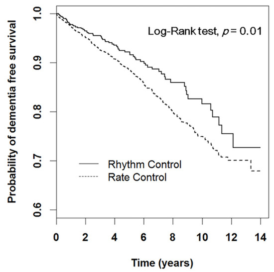 Firstly, this is a retrospective observational cohort study, and the diagnosis of dementia was obtained according to the ICD-9-CM codes registered by physicians and re-confirmed by a certified coding specialist. We could not completely exclude the possibility of miscoding. Since patients’ information is anonymous, detailed information regarding the National Institute on Aging and Alzheimer’s Association (NIA-AA) scores for the diagnosis of dementia along with the image studies were not available [24]. Secondly, the subtypes of AF (paroxysmal, persistent, and permanent) and AF duration could not be differentiated using the ICD-9-CM codes, and this was a limitation as in our previous studies [10,25]. Whether AF subtypes might affect pharmacological rhythm control efficacy remains unclear. Thirdly, the cohort was quite outdated, as demonstrated by the high aspirin use rate before non-vitamin K oral anticoagulant drug (NOAC) was available for stroke prevention. Whether our results can be applied to the era of NOAC remains to be explored. Fourthly, the patient numbers and baseline characteristics (e.g., age, hypertension, heart failure, and medications used) were not evenly distributed in both groups, indicating that heterogeneities might exist between both groups. The reason why the age of patients in the rate control group was higher than that in the rhythm control group remained unclear. One possible explanation could be that the physicians tended to adapt the rate control strategy to older patients because rate control medications were associated with less adverse effects compared to rhythm control medications. To reduce the confounding bias, we built another cohort by matching the two groups with age and gender in a 1:1 ratio. In this matched cohort, the rhythm control group consistently showed a lower risk of dementia than rate control (p = 0.009). This finding might support the main conclusion in the original study cohort. Finally, despite having adjusted the multivariable Cox hazards regression model according to baseline characteristics, co-morbidities, and propensity scores, along with performing a subgroup analysis to minimize the impact of selection bias on study outcomes, our results should be interpreted with caution because the baseline medications used were not adjusted in the regression model, and the risk factors in the matched cohort were not completely eliminated. In this study, rhythm control was defined as any use of AADs on top of rate control therapy as mandated by guidelines. Therefore, we cannot discount any additive/synergistic effects of the combination of therapies resulting in better outcomes in rhythm over the rate control cohort.