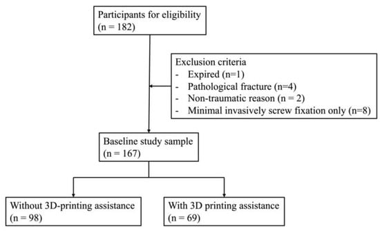 There were 182 adult male participants aged 18–60 years who received operative treatment of pelvic or acetabular fracture from August 2009 to December 2021. Patients with pathological fracture (n = 4), those who received only minimally invasive screw fixation surgery for pelvic or acetabulum fracture (n = 8) due to an old fracture with delayed union (n = 2), and those who died (n = 1) were excluded. Finally, a total of 167 consecutive patients were included in this study (Figure 1). We divided the participants into patients without 3D printing assistance for pelvic or acetabular fracture surgery (n = 98) and patients with 3D printing assistance (n = 69). The patients’ demographic characteristics are provided in Table 1. In the group without 3D printing assistance, the median age was 32 (23.75–44) years old. In the group with 3D printing assistance, the median age was 35 (27–48.5) years old. The median ISS of the group without 3D printing assistance was 10 (9–22.75), and that of the group with 3D printing assistance was 9 (9–22). In the groups without and with 3D assistance, the median LHSs were 18 (13–26) and 21 (13–27) days, respectively. The median of the duration from injury to pelvic or acetabular surgery was 4 days in both groups. In the groups without and with 3D assistance, 36.7% and 38.3% of the patients, respectively, received two surgical procedures for pelvic or acetabular fractures. The primary cause of pelvic or acetabular fractures was traffic accidents, especially motorcycle accidents and pedestrians being hit by vehicles (69.5% of total participants), and the second cause was falls from height (26.9% of total participants). Other reasons for pelvic or acetabular fracture included crushing injuries and work accidents. Most of the parameters of the two groups had no significant differences, except platelet levels, but the median platelet levels of both groups were within the normal range.