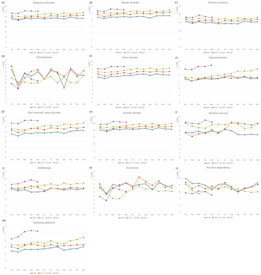 Monthly medical visits for psychological diseases in 2018, 2019, 2020, and 2021. The incidences of (A) depressive disorder, (B) bipolar disorder, (C) primary insomnia, (D) schizophrenia, (E) panic disorder, (F) hypochondriasis, (G) posttraumatic stress disorder, (H) anxiety disorder, (I) anorexia nervosa, (J) addephagia, (K) alcoholism, (L) nicotine dependency, and (M) gambling addiction.