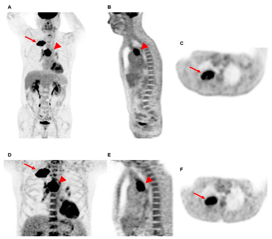 Maximum intensity projection (A), coronal (B), and transaxial (C) images of early PET/CT scan, and maximum intensity projection (D), coronal (E), and transaxial (F) images of delayed PET/CT scan of a 69-year-old man with squamous cell carcinoma. The primary lung cancer lesion at the right upper lobe (arrows on A,C,D,F) and metastatic lymphadenopathy at the right lower paratracheal area (arrowheads on A,B,D,E) show intensely increased [18F]FDG uptake. The maximum SUV of the primary lung cancer was 21.10 on early PET/CT and 28.57 on delayed PET/CT; thereby, ∆maximum SUV was 35.40. The BM SUV was 2.49 on early PET/CT and 3.65 on delayed PET/CT, resulting in a ∆BM SUV of 46.60. The patient was clinically diagnosed with a T3N2M0 stage and received concurrent chemoradiation therapy. At 11.2 months after the treatment, multiple distant metastatic lesions were newly detected and the cancer was determined to have progressed.