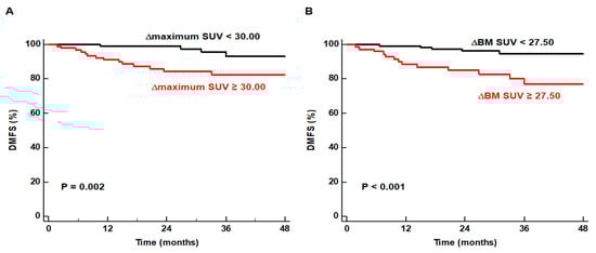 For Kaplan–Meier analysis, the ∆maximum SUV and ∆BM SUV were categorized into two groups according to the specific cut-off values (30.00 for ∆maximum SUV and 27.50 for ∆BM SUV). The results of the Kaplan–Meier analysis demonstrated that patients with a high ∆maximum SUV and ∆BM SUV had significantly worse DMFS than those with low values (p = 0.002 for ∆maximum SUV and p < 0.001 for ∆BM SUV; Figure 3).