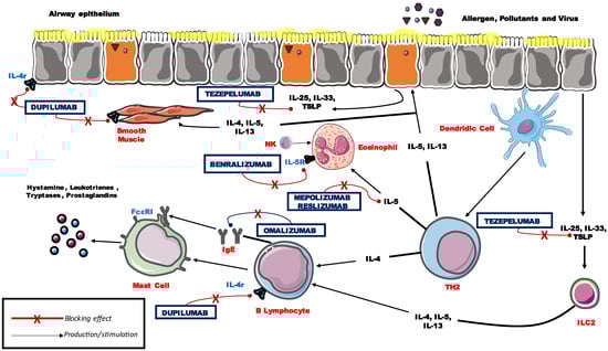 - Parulekar, A.D.; Diamant, Z.; Hanania, N.A. Role of Biologics Targeting Type 2 Airway Inflammation in Asthma: What Have We Learned so Far? Curr. Opin. Pulm. Med. 2017, 23, 3–11. [Google Scholar] [CrossRef] [PubMed] [Green Version]