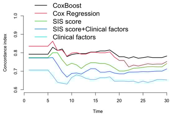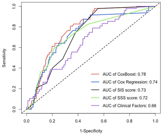 - Harald Binder. CoxBoost, Cox Models by Likelihood Based Boosting for a Single Survival Endpoint or Competing Risks. R Package Version 1.4. Available online: https://cran/R-project.org/package=CoxBoost.2013 (accessed on 2 March 2022).