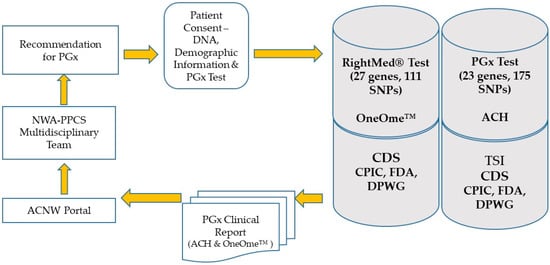 Following NWA-PPCS multidisciplinary team discussions and recommendations, patients were deemed appropriate for PGx testing, and typical genetic testing consent for the PGx testing was obtained from the parent/guardian. Medical consent was a two-step process. First, verbal consent was obtained after describing the purpose and potential benefit of PGx testing for improving the medication therapy. Second, the parent/guardian completed the consent form for PGx testing.