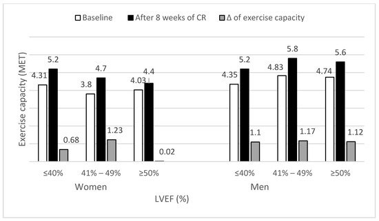 There were only seven women with reduced left ventricular ejection fraction (LVEF ≤ 40%), and the exercise capacity did not change after CR in this group. A significant increase of exercise capacity by 1.23 MET was recorded only in women with LVEF 41–49%, while in woman with LVEF≥ 50%, exercise capacity increased by 0.02 MET. In all three male subgroups, exercise capacity increased similarly from 1.1–1.17 MET (Table 5, Figure 3).