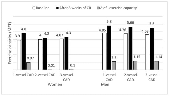 Many studies have shown that exercise capacity is a stronger predictor of mortality risk than traditional risk factors such as smoking, hypertension, hyperlipidemia, obesity, and type 2 diabetes. Moreover, exercise capacity is considered to be a more powerful predictor of risk than other exercise test variables, such as ST segment depression, exercise-related symptoms, and hemodynamic responses [17,18]. According to previous research, the increase of exercise capacity by each 1 MET was connected with a reduced risk of cardiovascular mortality by 12% [5], by 16.1% [19], and even by 26% [6]. In our investigation, although the exercise capacity of examined women improved, the increase was lower than 1 MET and was statistically lower when compared to men. Previously published studies showed a significant increase in exercise capacity after CR regardless of gender [20,21,22,23,24,25,26], although there are not many studies available comparing the effect of CR on exercise capacity in women and men, and the outcomes of these studies are inconsistent. Some studies reported that the improvements in exercise capacity after CR are greater in men than women. [25,26] Other studies showed no difference in functional capacity improvements between men and women after CR [27,28]. In these two studies, which showed a similar increase in exercise capacity in men and women, exercise capacity was assessed on the basis of 6-Minute Walk Test (6MWT), not an exercise test on a treadmill or cycle ergometer with estimation of METs or directly measured VO2max. This might be a possible explanation of the inconsistent results of studies designed differently.
