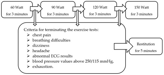 Scheme of the multistage, symptom-limited exercise test on the cycle ergometer.