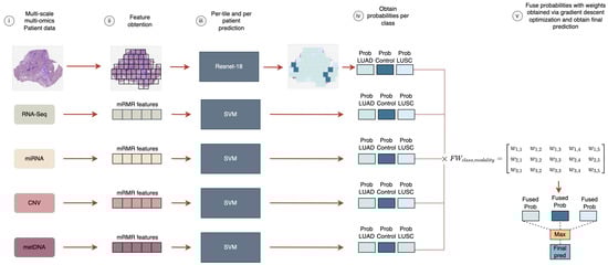 Prediction pipeline for a given sample with multiple modalities. If missing information is present, the probabilities for that modality are zero. (i) Multi-scale and multi-omic data available for each sample are obtained. (ii) For the imaging modality, non-overlapping tissue tiles of 512 × 512 are obtained. For the molecular modalities, the features are obtained with the aforementioned preprocessing methodology (see Section 3). (iii) Probabilities are computed for each modality and class. In the molecular modalities the probabilities are returned by the machine learning model. For the imaging modality, the probabilities are obtained based on the number of tiles predicted per class divided by the total number of tiles. (iv) The late fusion model is applied using the previously obtained weights via the gradient optimization, and the final prediction is obtained. (v) Fuse probabilities with weights obtained via gradient descent optimization and obtain final prediction.