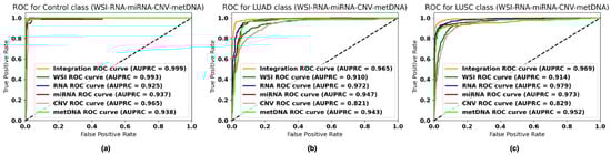 ROC curves for the fusion and individual models over all available samples for each modality. (a) ROC curve for LUAD class. (b) ROC curve for control class. (c) ROC curve for LUSC class.