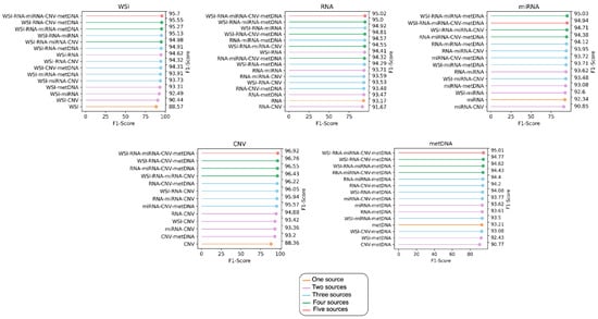 Except for miRNA-Seq samples, the fusion that achieves the best performance is when fusing the five sources. However, the improvement is small in comparison with using four sources, so not having all of them does not excessively affect the classification performance. Fusing only CNV with metDNA RNA or miRNA-Seq worsens the performance in comparison to the usage of them independently, which could be due to the imbalance in the classes (Table 2). The combination of metDNA and WSI also performs poorly, maybe due to the fact that it has been shown in the literature that WSI reflects information about the methylation patterns of human tumors [], and therefore, they might not be complementing each other. However, in most cases, including additional information improves the results that can be obtained by each independent source.