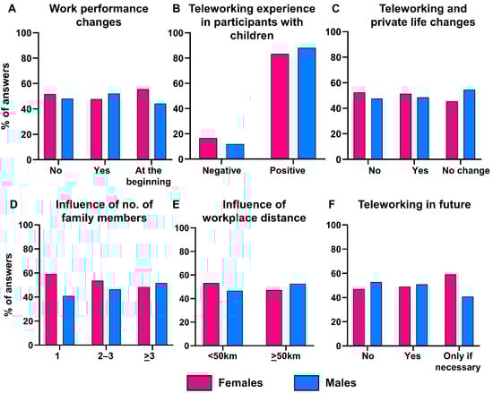 Gender differences and teleworking during COVID-19 pandemic. (A) Differences in work performance were stratified by gender and reported as bar graphs. (B) Teleworking experience in females with children, and (C) influence in private life stratified by gender. Among participants with a positive experience with teleworking, the impact of the number of family members (D) and home-to-workplace distance (E) was investigated after stratification by gender. (F) Percent of answers about willingness to continuing teleworking even after pandemic, stratified by gender.