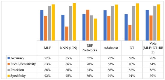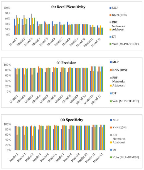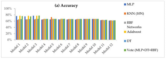 Model 3 represents the highest accuracies for all classifiers compared with the other 11 models. The accuracies for MLP, KNN, RBF networks, AdaBoost, DT, and voting algorithm are 77%, 65%, 67%, 77%, 67%, and 78%, respectively. In Figure 1b, Model 3 achieved the highest recall rate for all classifiers except MLP and AdaBoost. Figure 2 shows the performance of the classifiers for the four evaluation metrics of the third model.