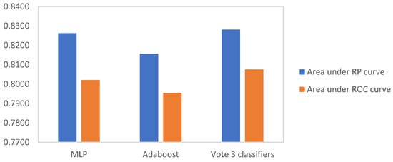 Area under RP curve and ROC curve for MLP, AdaBoost, and voting algorithm.