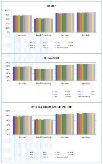 The voting algorithm emerged as the superior classifier in comparison to MLP and AdaBoost, exhibiting the greatest AUC while achieving 78% accuracy, 64% recall, 88% precision, and 92% specificity. The results of the sensitivity analysis are summarized in Figure 4.