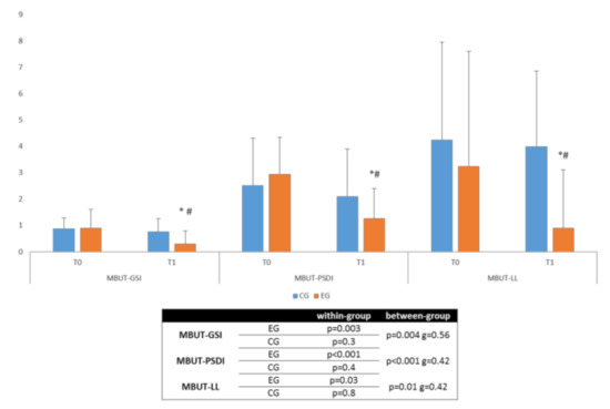 Primary outcome measures (median + interquartile range). * significant within-group differences, # significant between-group differences. Legend: EG, experimental group; CG, control group; T0, evaluation at baseline; T1, evaluation at the end of the protocol; MBUT, Modified Body Uneasiness Test; GSI, General Severity Index; PSDI, Positive Symptom Distress Index; LL, lower limbs; g, Hedges’ g standardized mean difference.