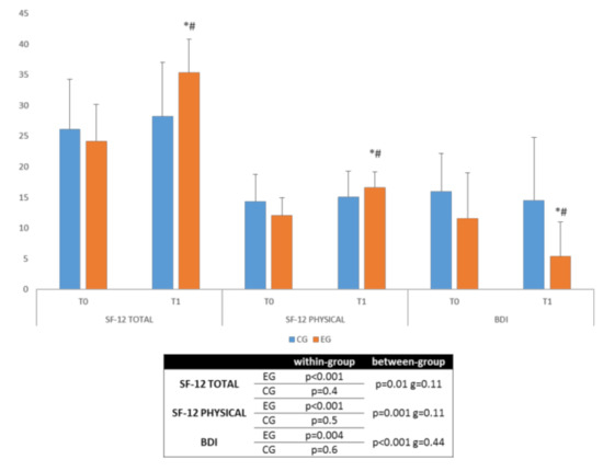 Secondary outcome measures (median + interquartile range). * significant within-group differences, # significant between-group differences. Legend: EG, experimental group; CG, control group; T0, evaluation at baseline; T1, evaluation at the end of the protocol; BDI, Beck Depression Inventory; SF-12 TOTAL, Short-Form-12 Health Survey Total; SF-12 PHYSICAL, Short-Form-12 Health Survey Physical; g, Hedges’ g standardized mean difference.
