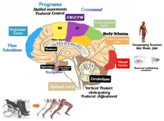 In support of this issue, Scandola et al., in a virtual reality study on the representation of peripersonal space in patients with SCI, found that the patients who retained sensory functions reported benefits on motor learning if exposed to visual–motor feedback [64]. Besides, the same authors had previously stated that some cognitive functions, such as body, action, and space representations, are internalized and that somatosensory input and motor output might be necessary to create and keep a correct BR [65]. In fact, BR involves multiple brain areas, such as primary and motor somatosensory cortices, where body topographic maps are defined. Body maps adapt to the interactions with the physical environment [66]. The multisensory signals of the visual, vestibular, auditory, somatosensory (proprioceptive), and visceral receptors affect various areas of the central nervous system, allowing postural control and movement. These signals provide cognitive and emotional cues to the cerebral cortex and the limbic system, allowing purposeful voluntary movements or emotional motor behaviors. Voluntary movements result from intentional motor commands that involve the cerebral cortex, the brain stem, and the spinal cord. Instead, emotional motor behavior depends on projections from the limbic hypothalamus to the brainstem (i.e., fight or flight reactions) [67,68]. The cognitive process of controlling gait and posture requires a complex network (Figure 4).
