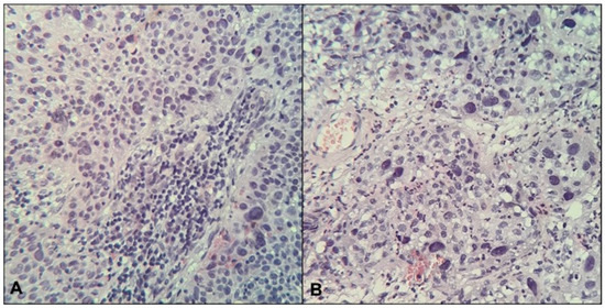 Histological sections (H&E, magnification 20×) of two cases of cervical cancer with high (A) and low (B) tumor-infiltrating lymphocytes (TILs).