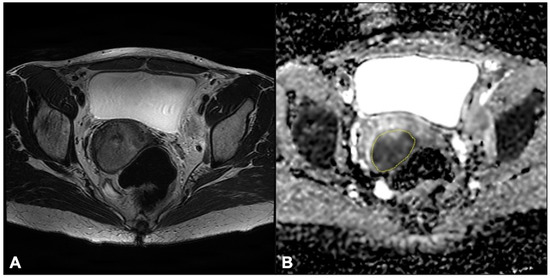 Axial T2-WI shows circumferential tumor tissue occupying the uterine cervix (A); 2D-ROI (dashed yellow line) drawn at the corresponding site of the lesion on the axial ADC map (B).