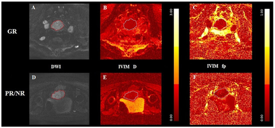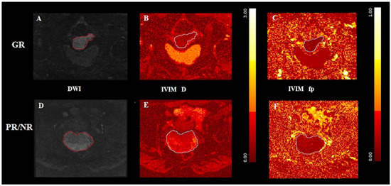 (A,D) A cervical squamous cell carcinoma displayed in DWI of good responder (A) and poor/non-responder (D), respectively; (B,E) the D map and (C,F) the fp map obtained from IVIM of the good responder GR in the top row and the poor/non-responder in the bottom row, respectively. Outlines indicate the tumor region. D is significantly higher in GR compared to PR/NR.
