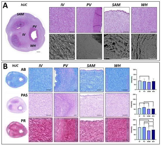 In situ histological (panel (A)) and histochemical analysis (panel (B)) of the human umbilical cord (hUC) and its different zones. Samples corresponding to the histological analysis were stained with hematoxylin-eosin (HE) or analyzed by scanning electron microscopy (SEM). Samples analyzed by histochemistry were subjected to alcian blue (AB), periodic acid-Schiff (PAS), and picrosirius red (PR) staining. The histochemical intensity obtained for each sample and each method is shown in the histograms to the right, with statistically significant differences shown as brackets. IV: intervascular zone; PV: perivascular zone; SAM: subamnioblastic zone; WH: Wharton zone. Scale bar = 200 µm.