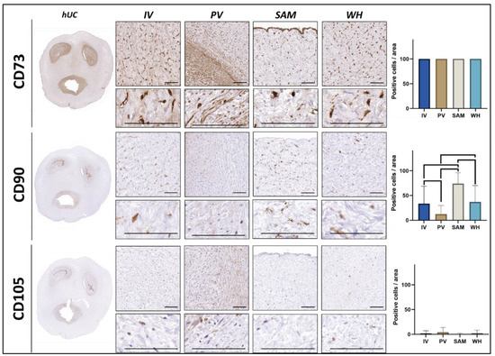 The characterization of relevant MSC markers in hUC cells was determined by immunohistochemistry for CD73, CD90, and CD105 markers. In the first place, the analysis in situ of hUC sections (Figure 2 and Table 1) revealed that CD73 was highly positive in all cells found in the four hUC zones (IV, PV, SAM, and WH), with no differences among zones. The CD90 marker revealed that the SAM region had the highest percentage of CD90-positive cells (73.97 ± 22.14%), followed by WH (36.95 ± 33.20%), IV (33.40 ± 35.41%), and PV (14.42 ± 20.78%). Differences were statistically significant for all comparisons, except for IV vs. WH. In addition, we found that the percentage of cells showing positive expression of the CD105 marker was very low in all zones (4.18 ± 11.41% in IV, 6.15 ± 16.53% in PV, 1.79 ± 8.73% in SAM, and 3.86 ± 9.69% in WH), with differences among zones being non-significant.