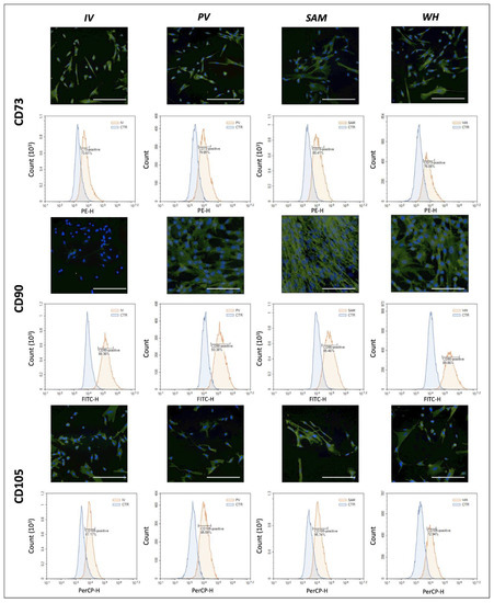 Analysis of relevant MSC markers in cells isolated from each zone of the human umbilical cord (hUC-MSC). For each marker, immunofluorescence images and flow cytometry distributions are shown. In the immunofluorescence images, a positive signal is shown in green, whereas cell nuclei are shown in blue. Scale bar = 200 µm.