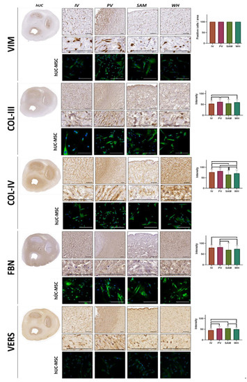 Immunohistochemical analysis of vimentin and four fibrillar (collagen type III—COL-III, and collagen type IV—COL-IV) and non-fibrillar (fibronectin—FBN, and versican—VERS) components of the ECM in the human umbilical cord (hUC) and its different zones. Images obtained at two different magnifications are shown for each marker. Quantification of the percentage of positive cells found in each sample and each method is shown in the histograms to the right, with statistically significant differences shown as brackets. Immunofluorescence images correspond to cells isolated from the hUC and kept in ex vivo culture (hUC-MSC), with positive signals shown in green, and cell nuclei shown in blue. IV: intervascular zone; PV: perivascular zone; SAM: subamnioblastic zone; WH: Wharton zone. Scale bar = 200 µm.