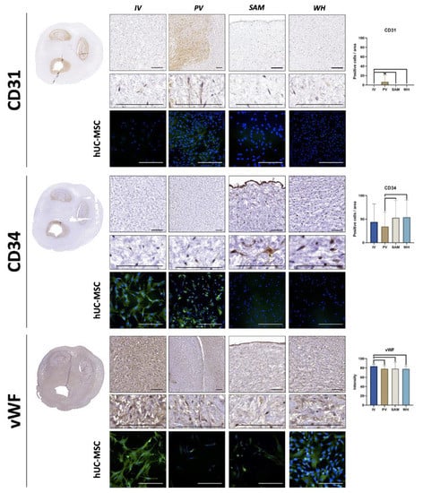 Immunohistochemical analysis of three vascular markers (CD31, CD34, and von Willebrand factor—vWF) in the human umbilical cord (hUC) and its different zones. Images obtained at two different magnifications are shown for each marker. Quantification of the percentage of positive cells found in each sample and each method is shown in the histograms to the right, with statistically significant differences shown as brackets. Immunofluorescence images correspond to cells isolated from the hUC and kept in ex vivo culture (hUC-MSC), with positive signals shown in green, and cell nuclei shown in blue. IV: intervascular zone; PV: perivascular zone; SAM: subamnioblastic zone; WH: Wharton zone. Scale bar = 200 µm.